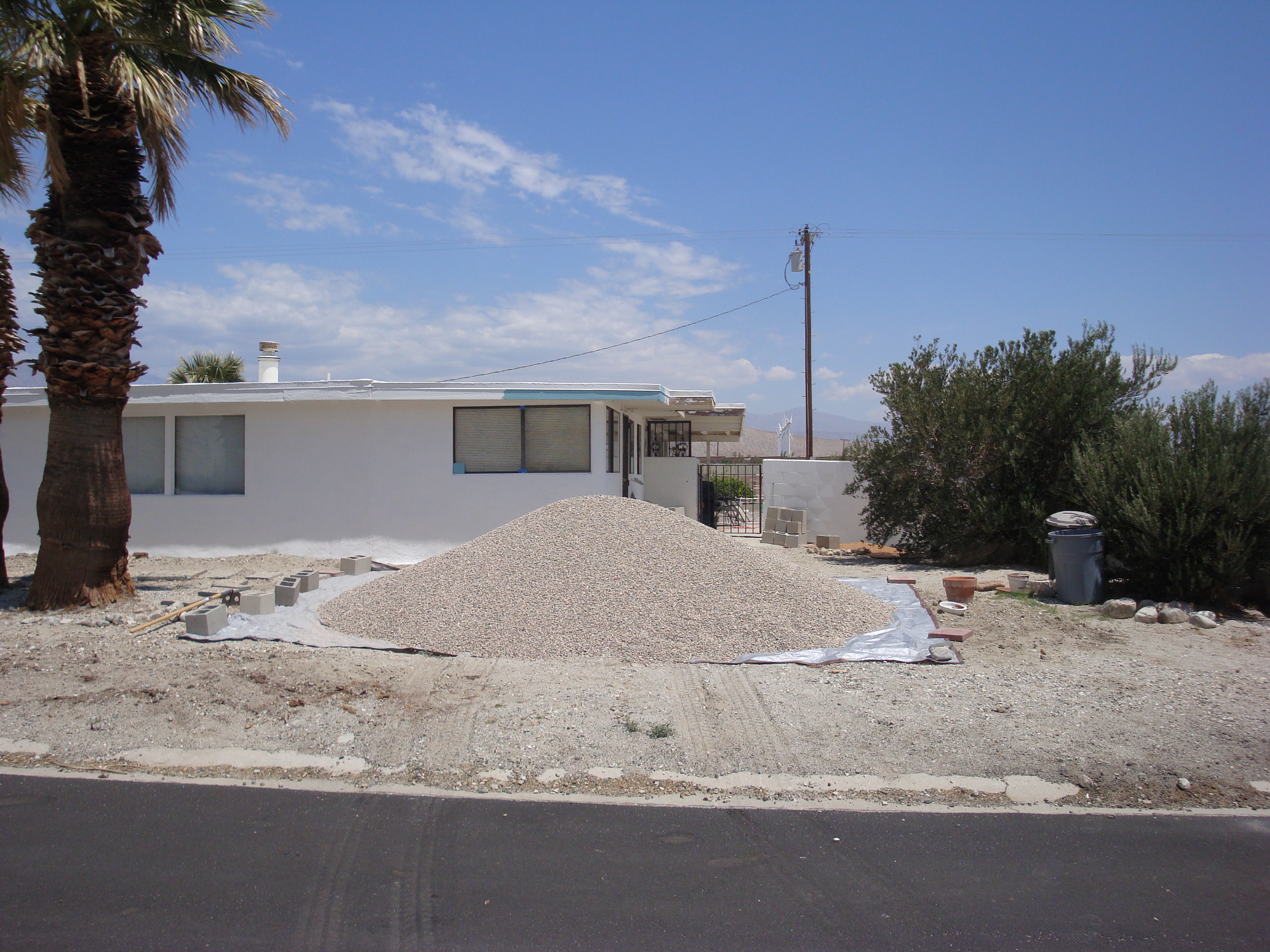Street view during renos. Note pile of 3/8" Del Rio pebbles.