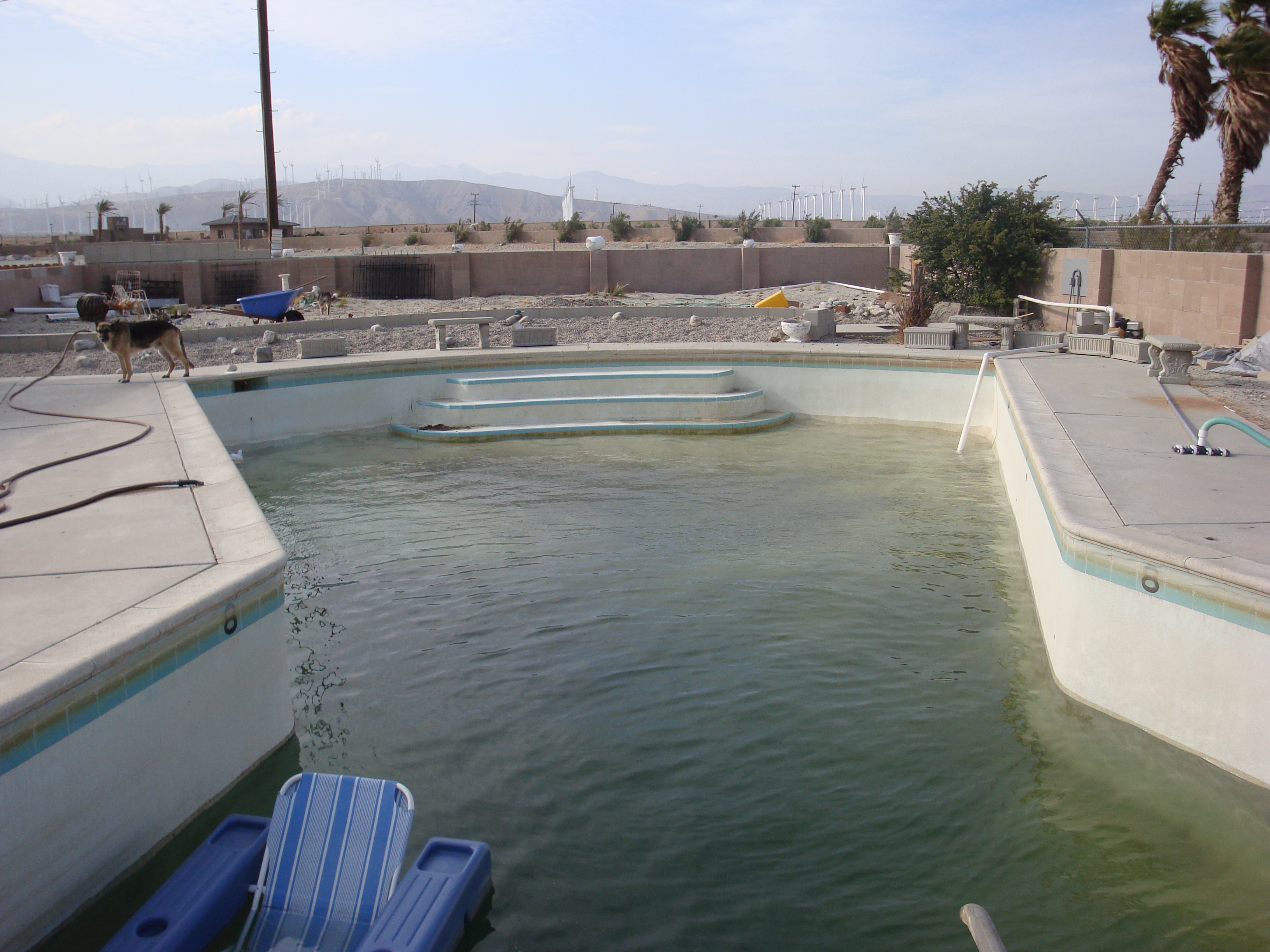 Eight foot deep 30,000 galllon guitar-shaped pool built to public pool standards. Water level lowered for upgrades.