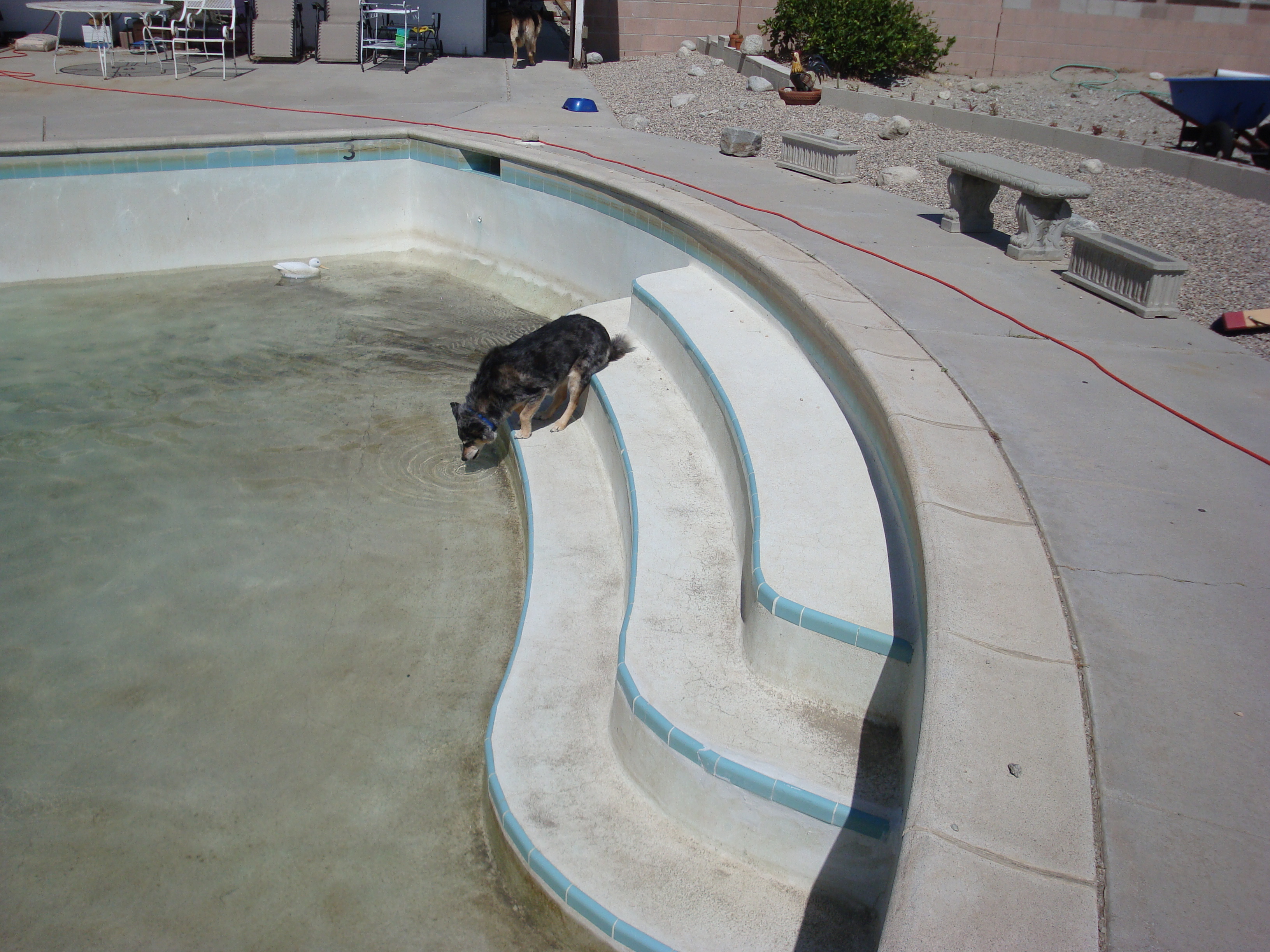 "Lady" the Australian Shepherd getting a drink. Diesel Vin Trienzbachtal ("Diesel") the German Shepherd in background.
