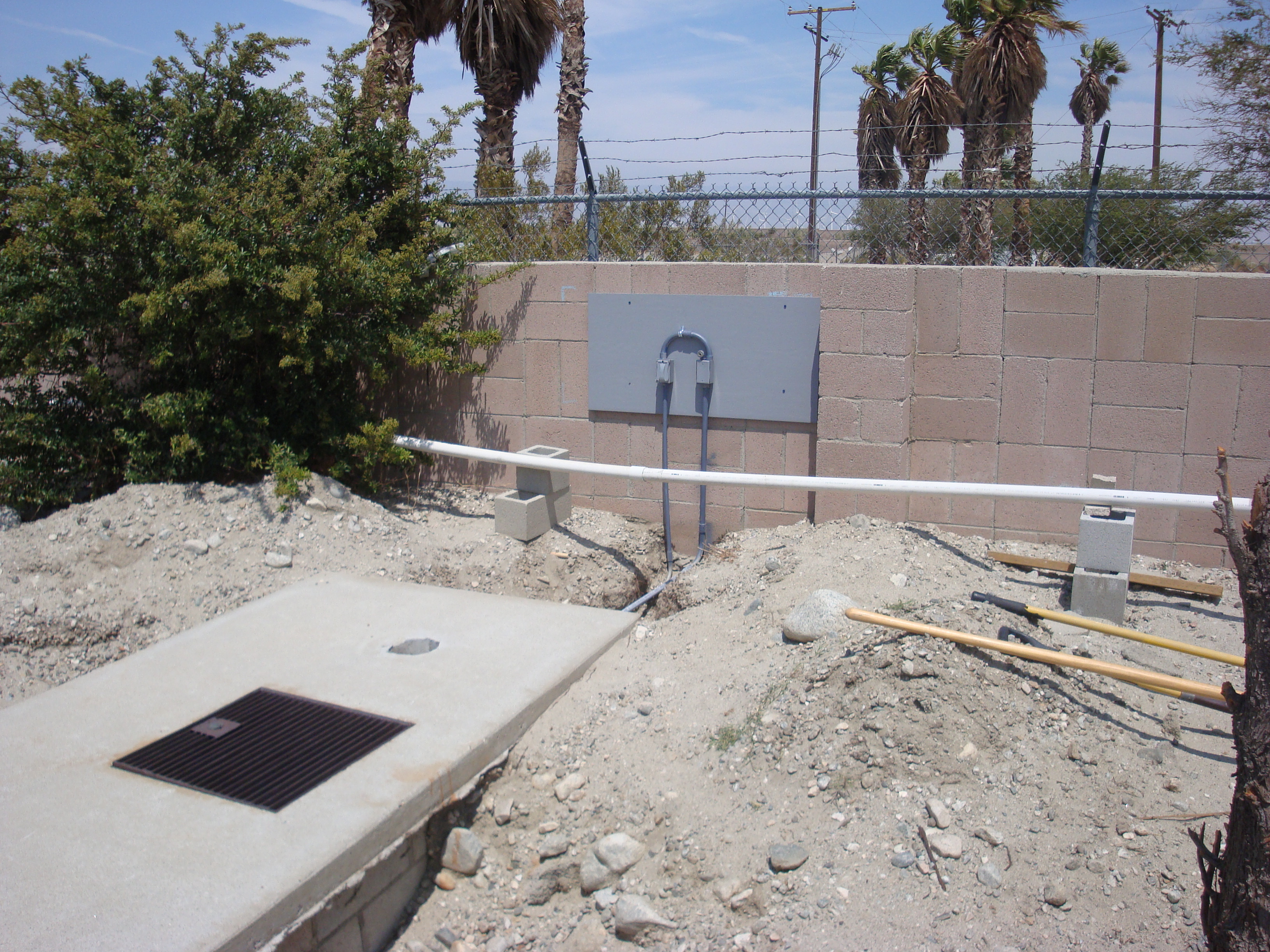 Existing underground pool equipment room and upgraded electrical work in progress.