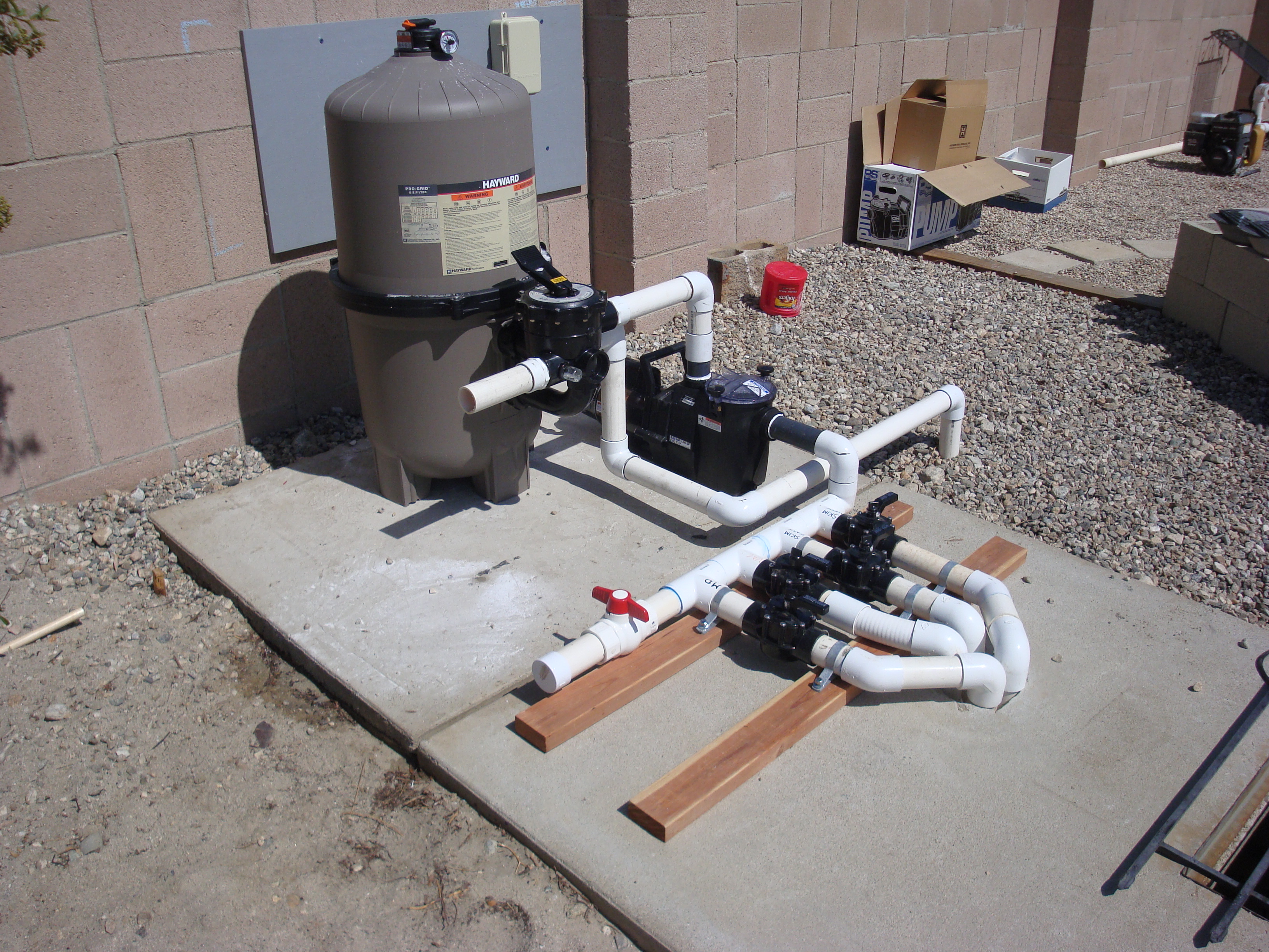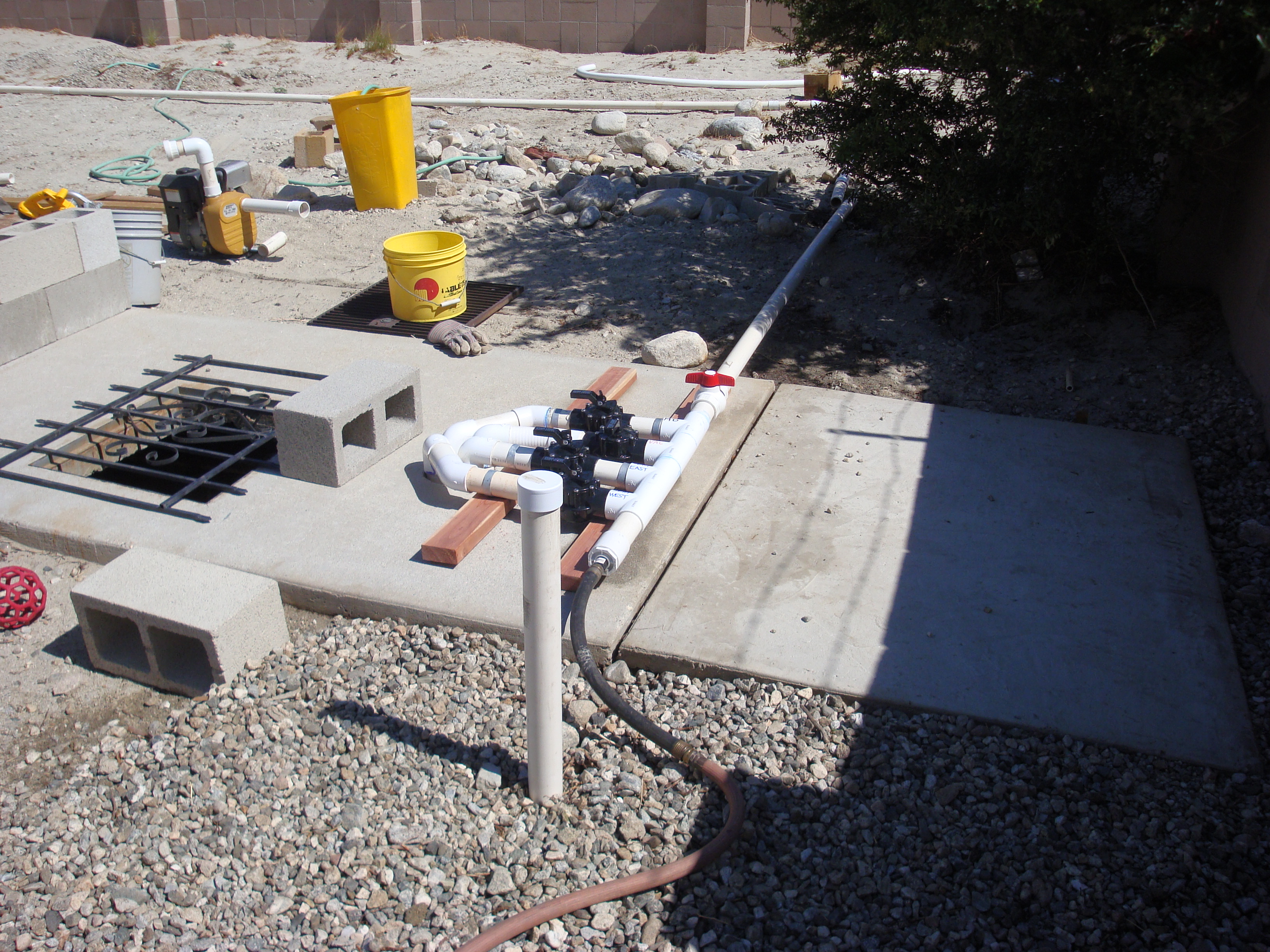Concrete pad for pool filter and pump. Valved manifold under pressure test.