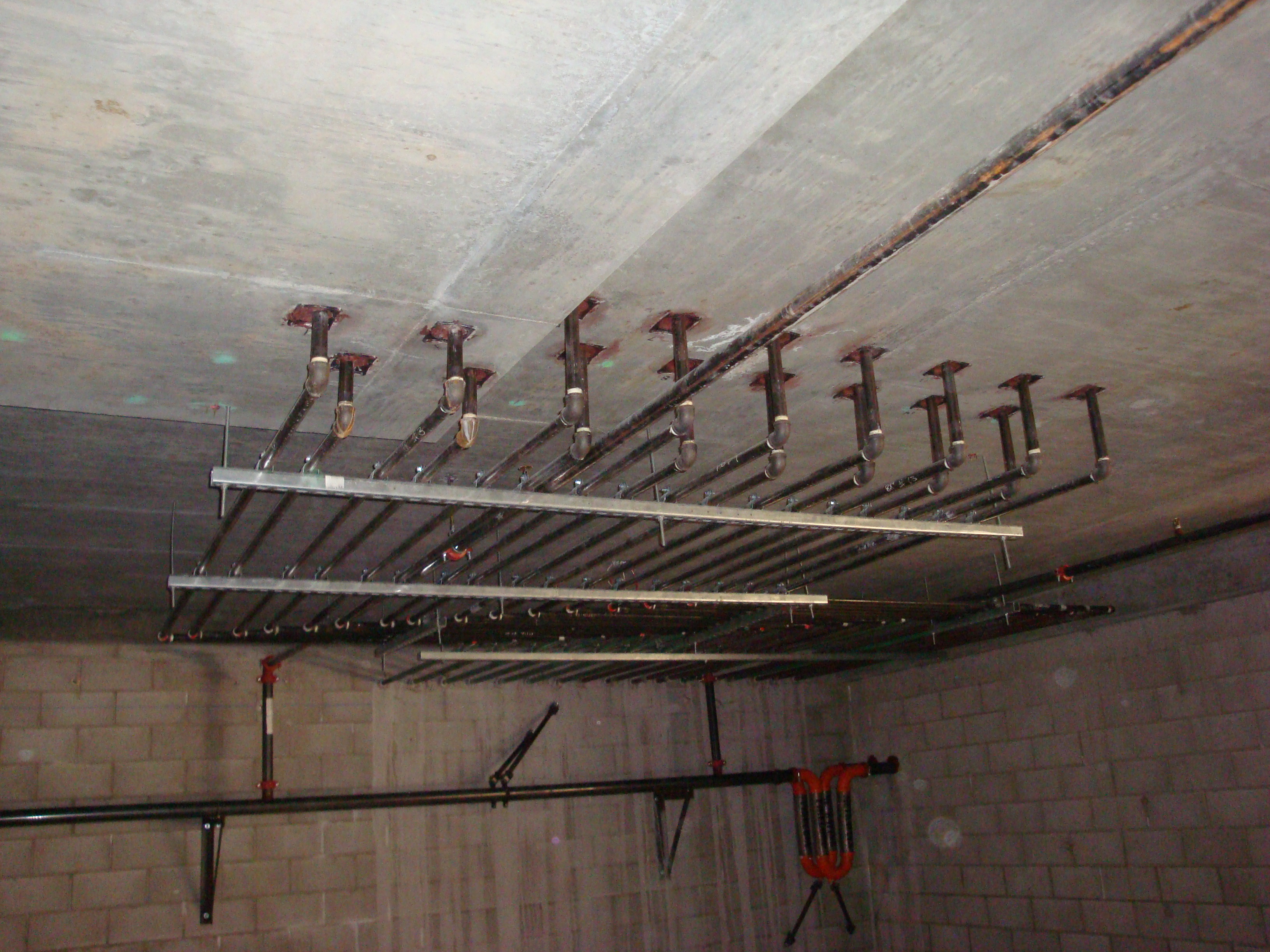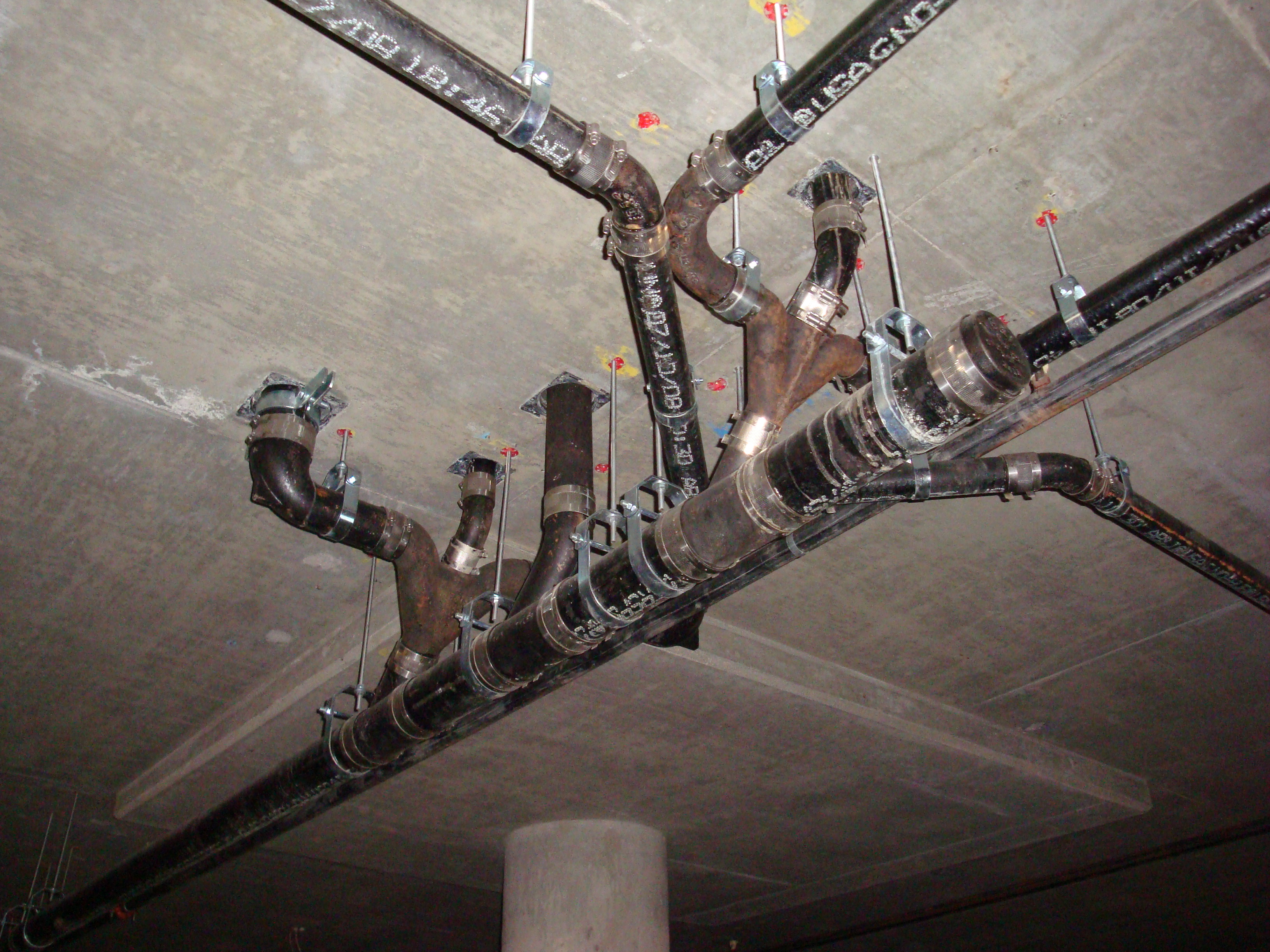 Construction phase - Drain, waste, vent piping in parking structure after painting |