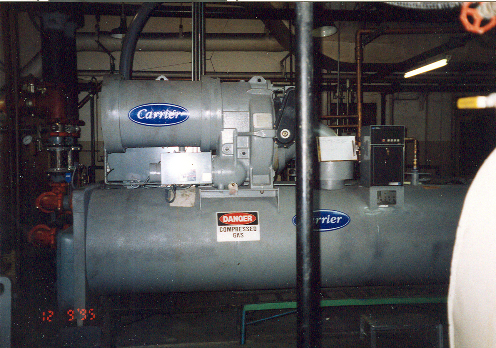 Replacement of two existing 4160 volt R-11 chillers with two 480 volt 450 ton R-134a water-cooled centrifugal chillers, including transformer and switchgear, in basement chiller and electrical rooms.