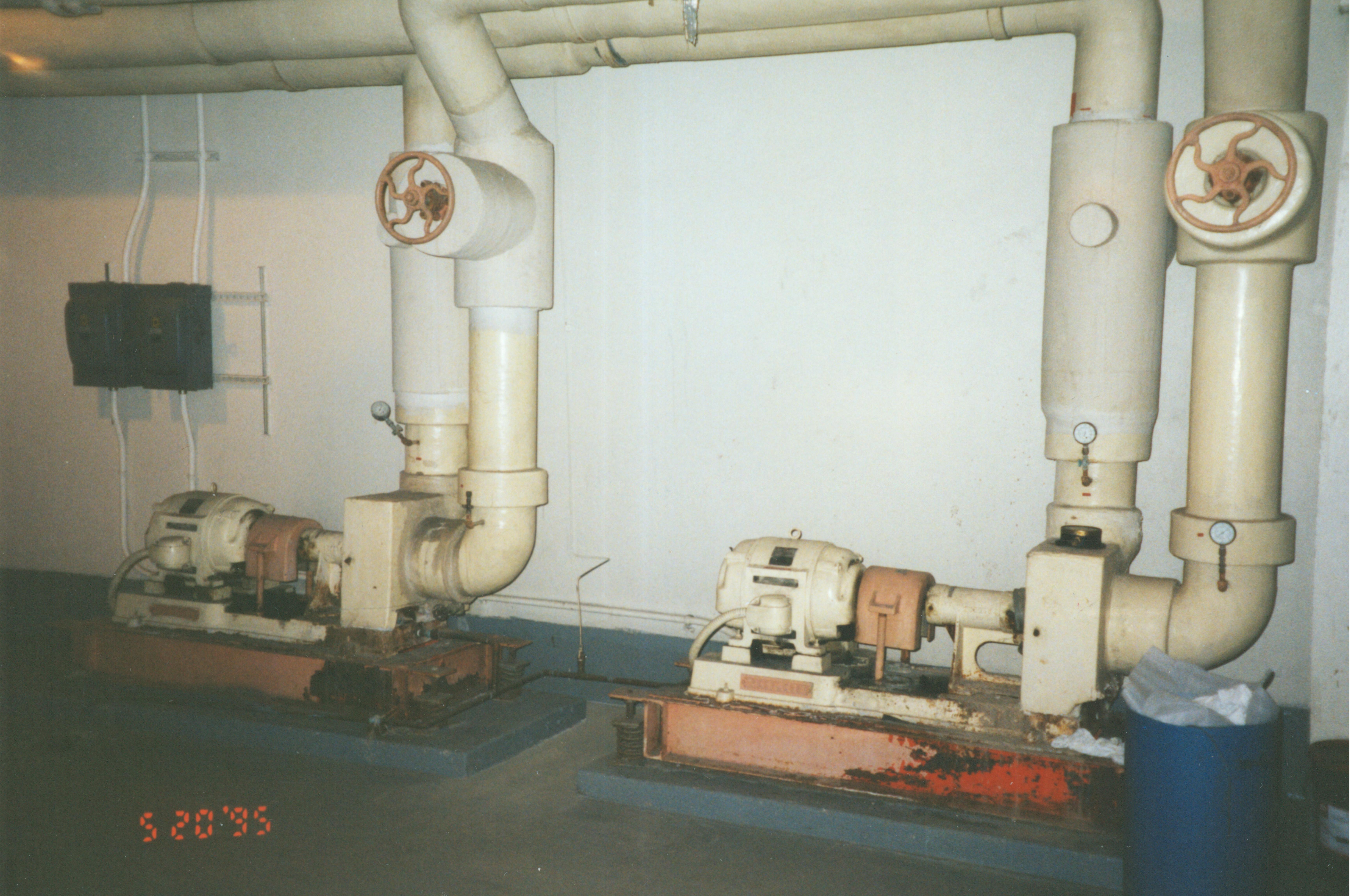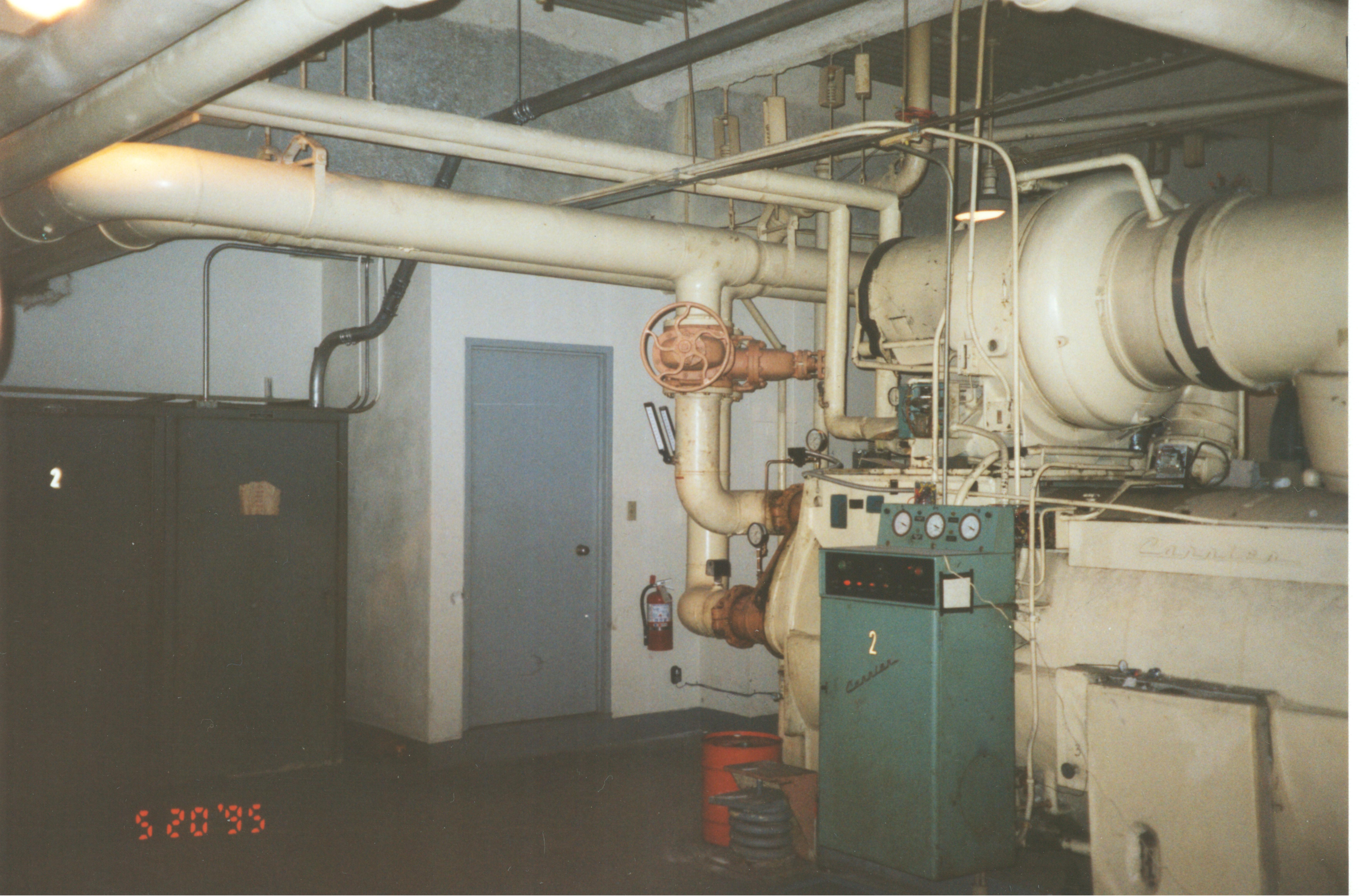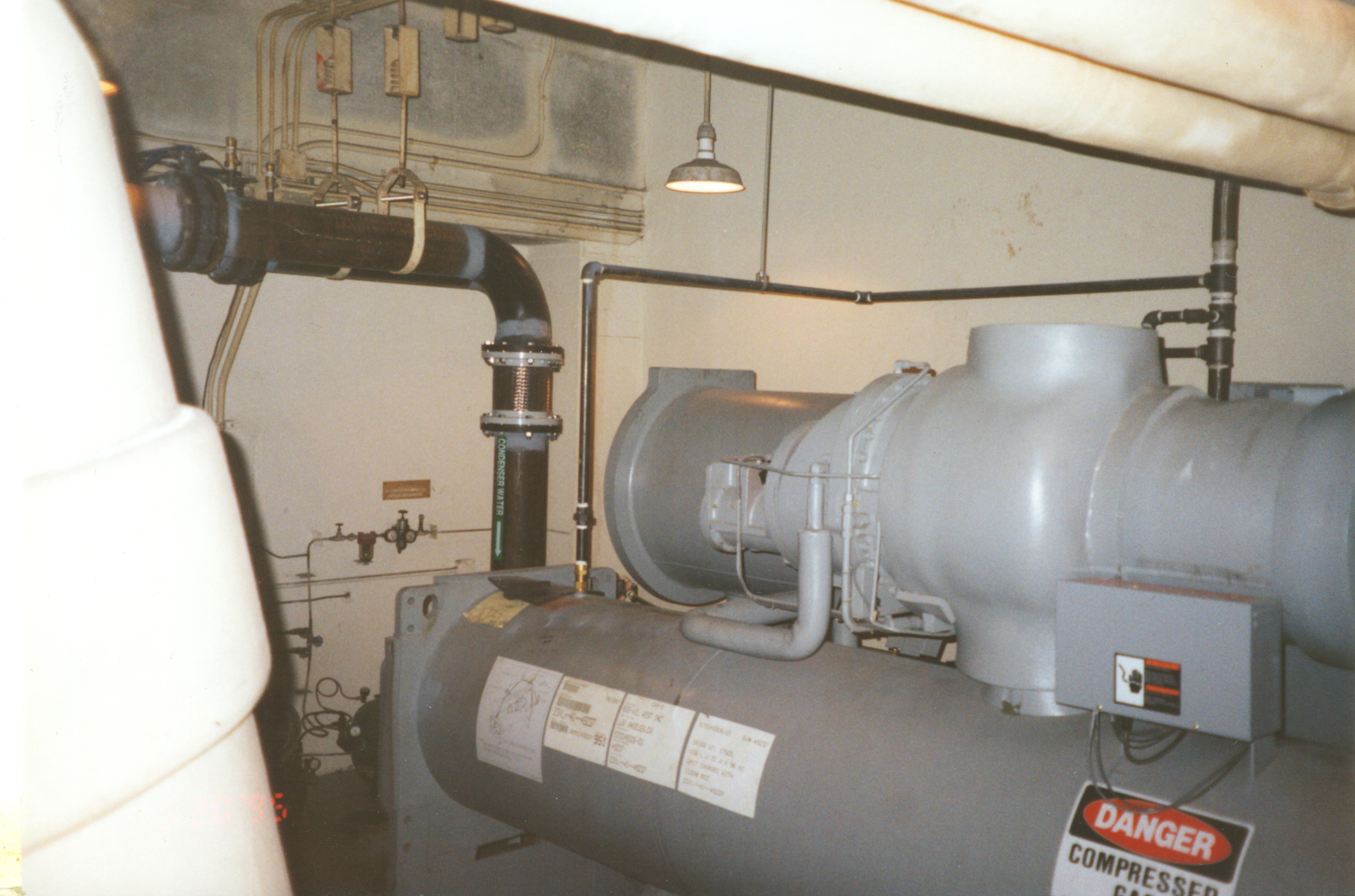 Replacement of existing R-11 chiller with 300 ton R-22 water-cooled single screw chiller, in penthouse chiller room, at office building.