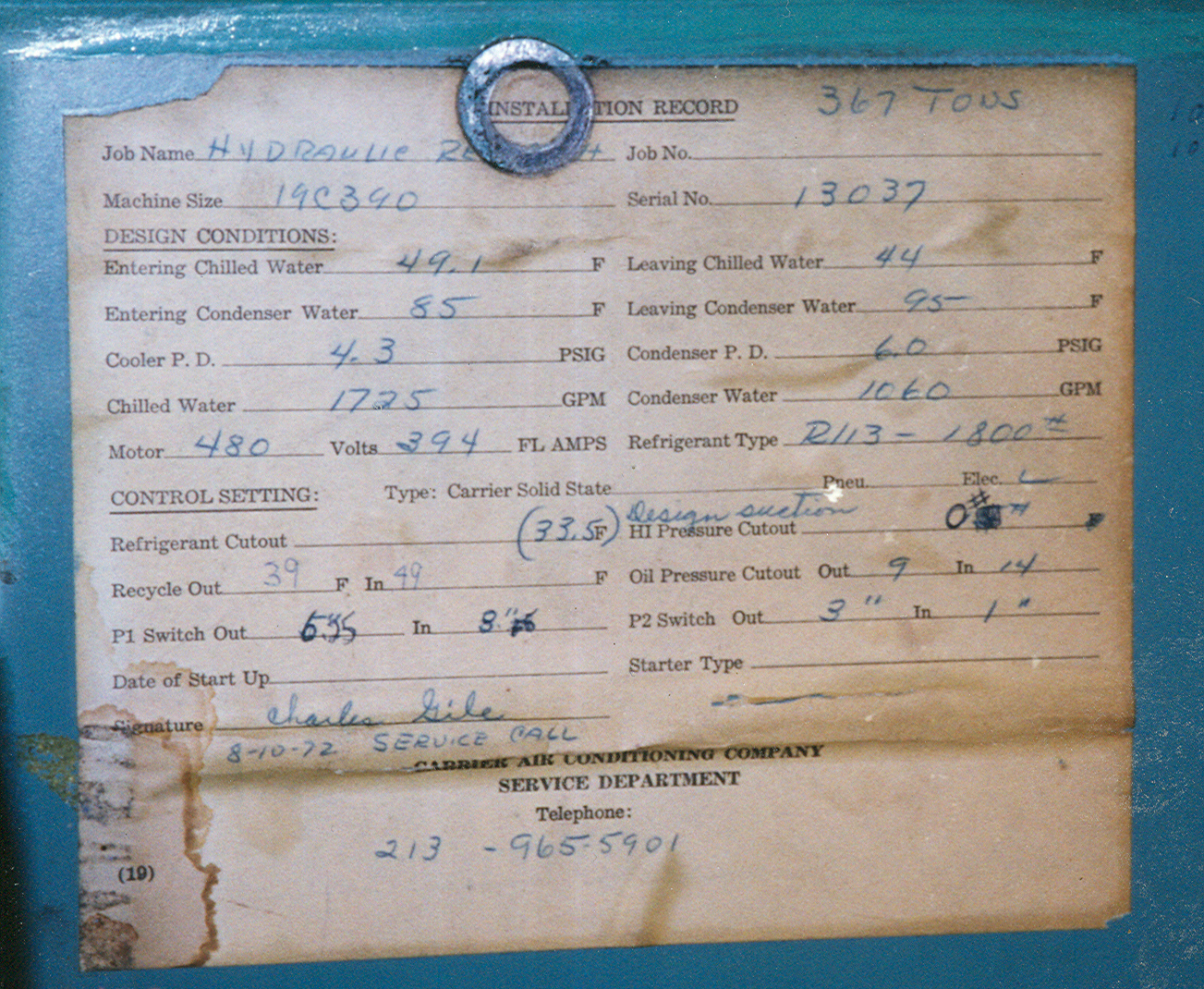 Original chiller start-up sheet (first machine in